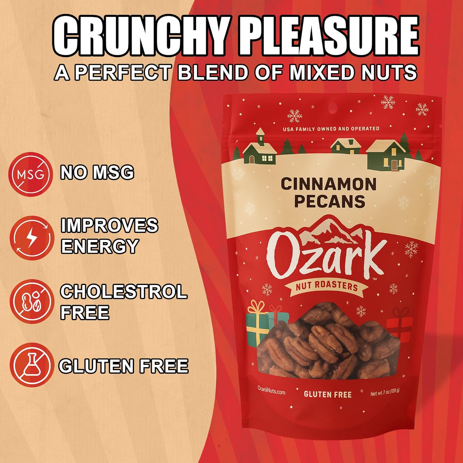 - HOLIDAY CINNAMON DELIGHT – Fresh roasted pecans coated in a sweet and spiced cinnamon glaze, perfect for the festive season.