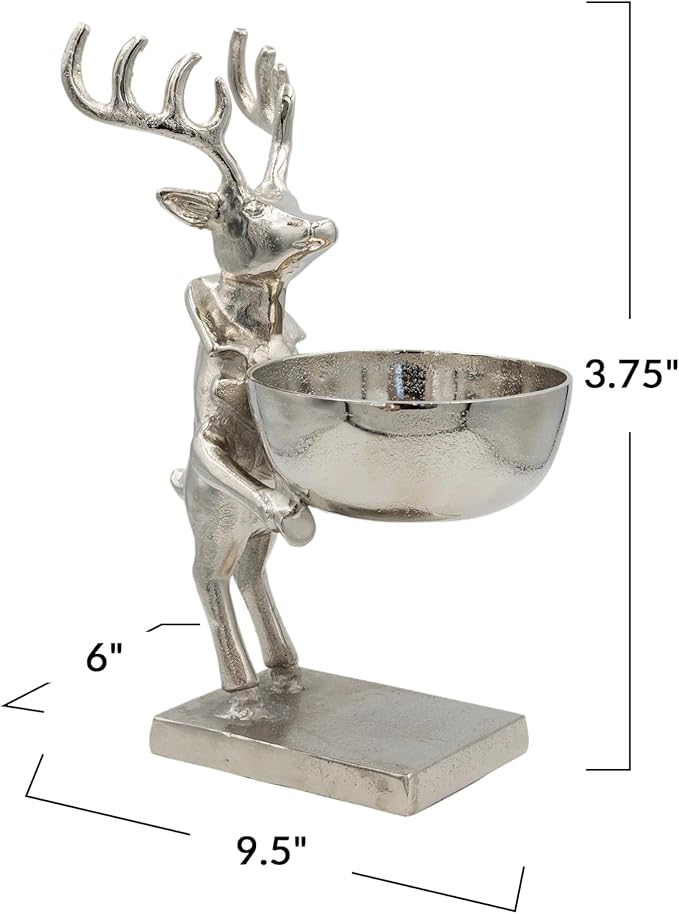 Crafted from durable cast aluminum with a sleek nickel finish, this decorative deer holding bowl combines unique design with functionality. Ideal as a centerpiece or accent piece, it offers both style and utility for any space.