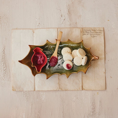 Holly Leaf-Shaped Serving Plate with Bamboo Spoon & Cardinal Dish