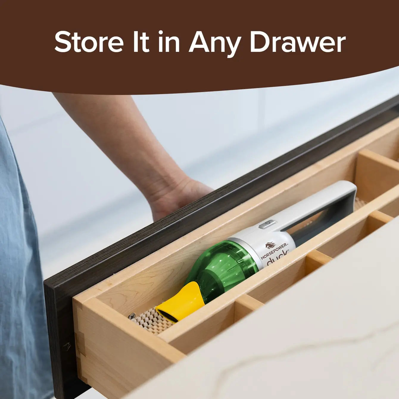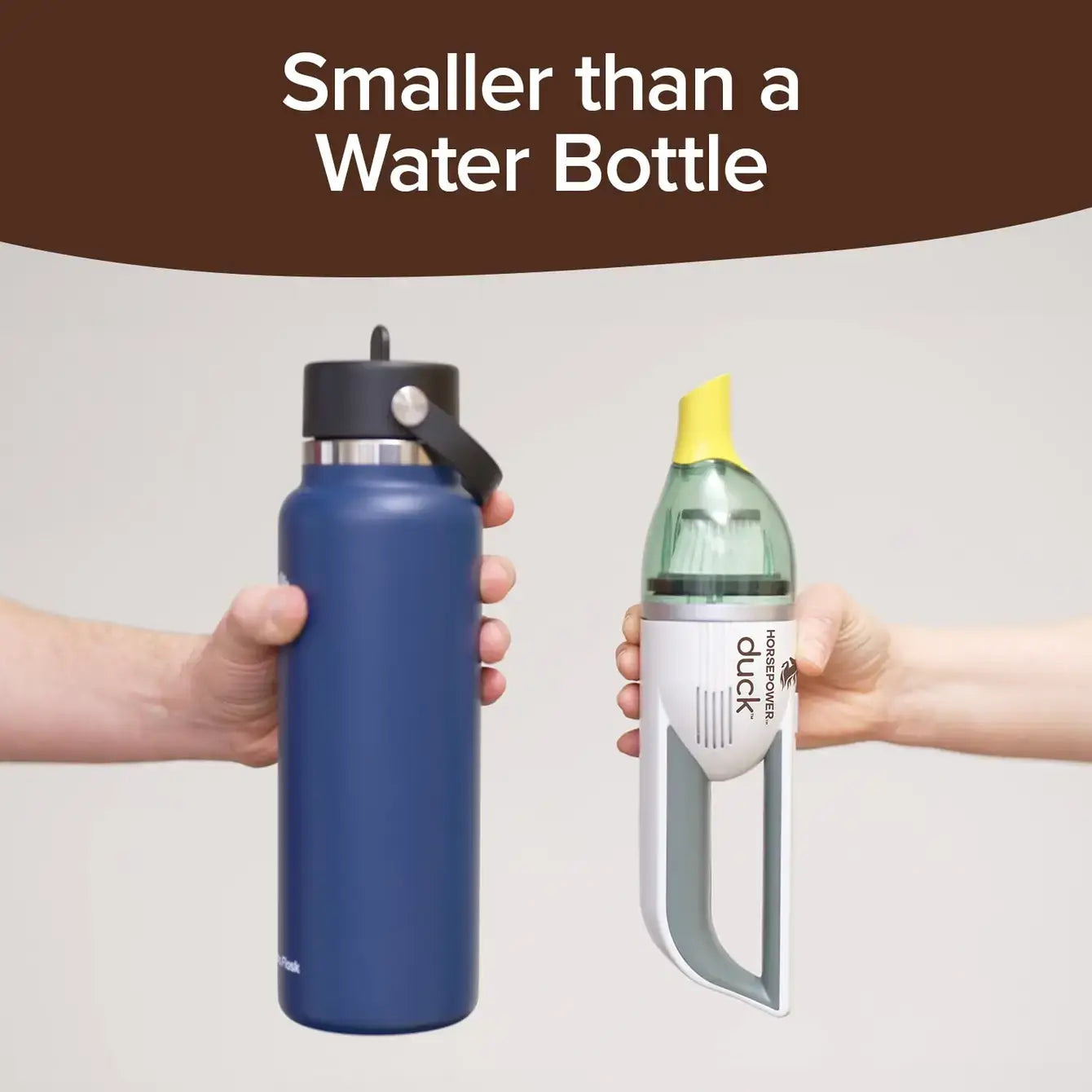 Are you tired of lugging around a heavy vacuum or wrestling with cords just to clean up everyday messes. The frustration of not being able to reach that little crumb in the car or the pet hair under the couch can turn cleaning into a daunting task. Enter the Horsepower Duck Vacuum - your savior in moments of messy despair. This lightweight, ultra-compact powerhouse swiftly sweeps away rice, dust, and debris without a whisper of complaint. With its cordless design and strong, rechargeable suction, Duck deftly navigates into the tiniest of spaces, making cleaning feel less like a chore and more like a breeze. Whether it's pet hair on the floor, sawdust in the garage, or crumbs in the car, just Duck it up and bask in the glory of a spotless space. Upgrade to Duck and transform clean-up from a headache to a hassle-free, quick, and satisfying check off your to-do list.