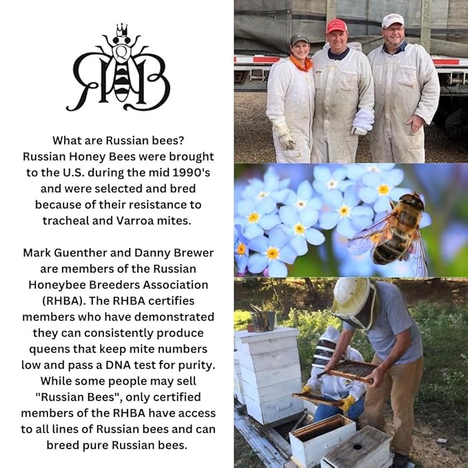 CERTIFIED RUSSIAN HONEYBEE BREEDERS: Guenther Apiary proudly belongs to the Russian Honeybee Breeders Association (RHBA). RHBA certification ensures their commitment to consistently producing queens that maintain low mite numbers and pass purity tests. While others may sell "Russian Bees," only RHBA-certified members like us have access to all lines of Russian bees and can breed pure Russian bees with confidence and expertise.