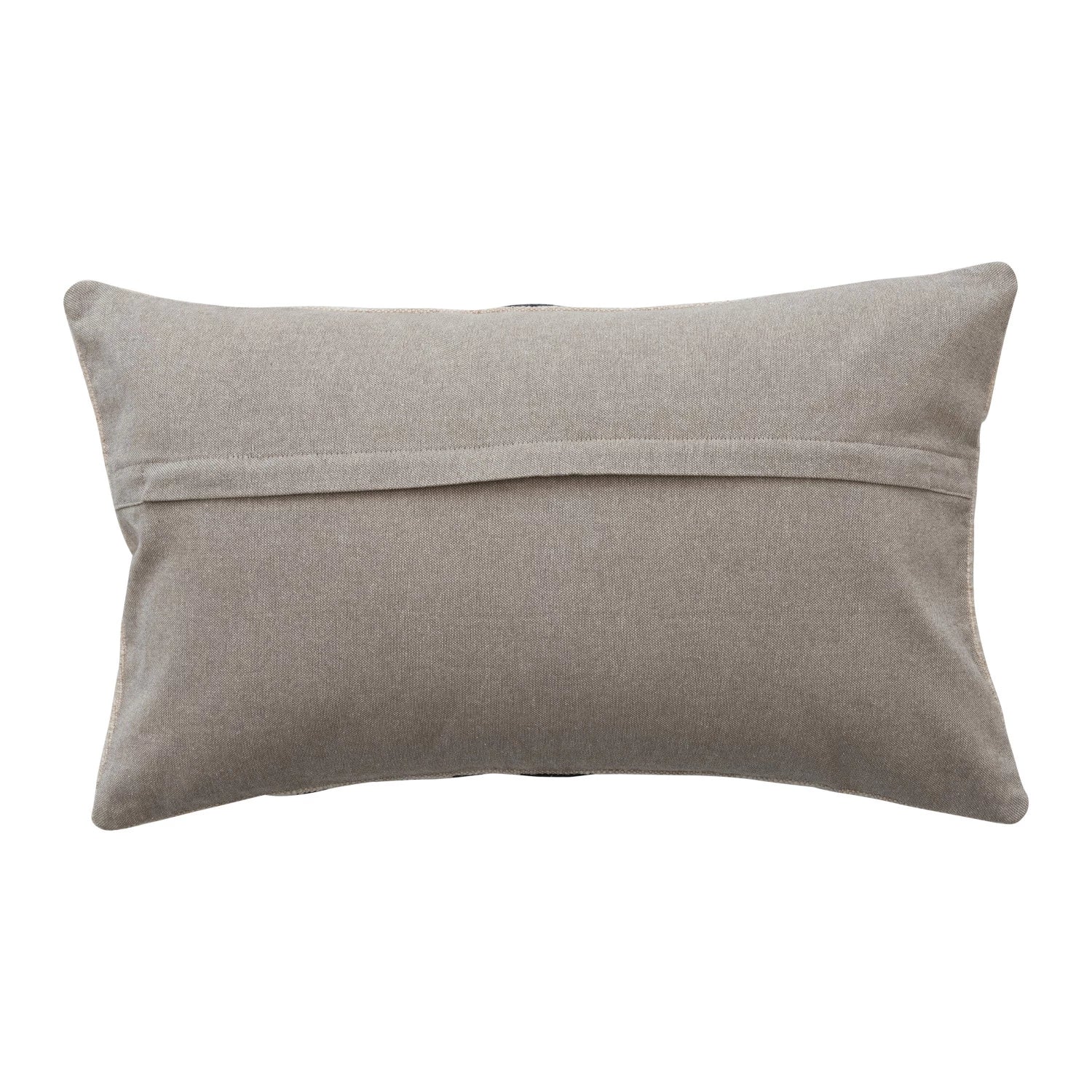 - A sophisticated lumbar pillow featuring an embroidered line design in natural and charcoal tones